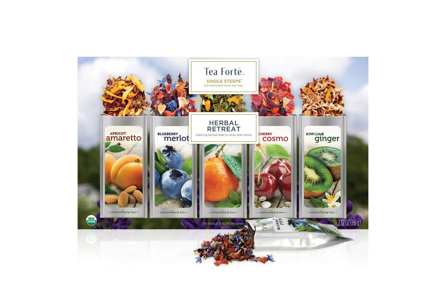 This organic tea sample box with five varieties of our fruity and intense teas such as Blueberry Merlot, Cherry Cosmot, Apricot Amaretto, Kiwi Lime Ginger and Mojito Marmalade. These teas are available in whole leaves. This Bulk Tea Box has 15 individual assorted bags, perfectly dosed for an infused quantity of 350 ml. Certified organic USDA Organic.